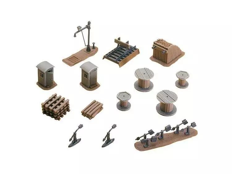 - Enthält Kabelrollen, Prellböcke, Streckentelefonhäuschen, Schwellenstapel, Wasserkran usw.