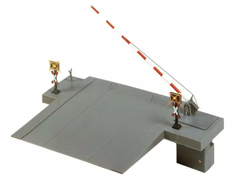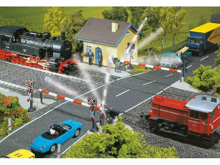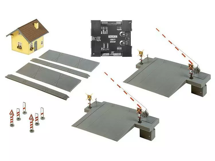 - Ausgerüstet mit 4 blinkenden Andreaskreuzen, 2 durchgehenden Schrankenbäumen und einer Bahnbude
