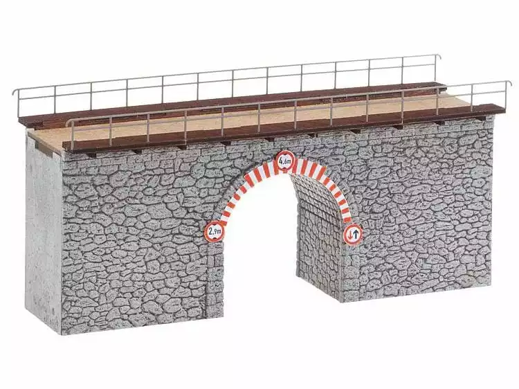 - Kleine, aus Natursteinen gemauerte Bogenbrücke mit seitlichen Lasercut-Gehwegen und einem Eisengeländer