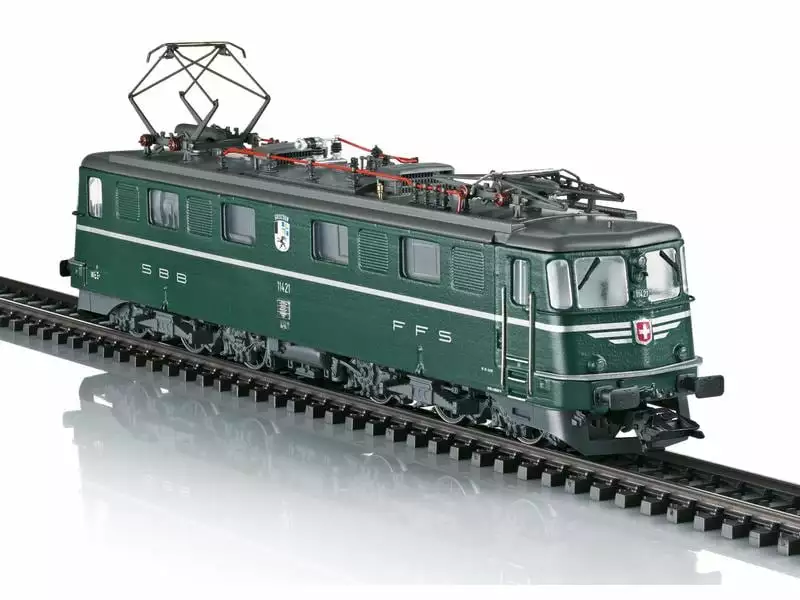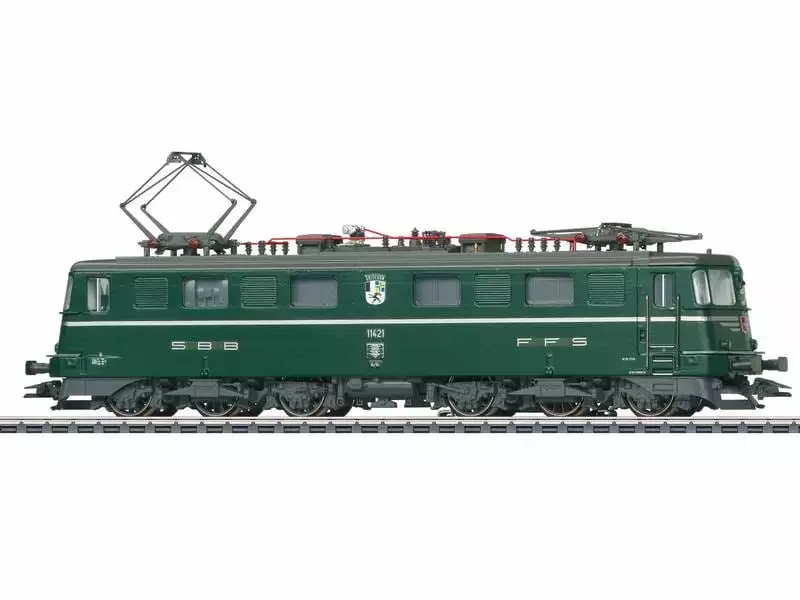 Elektrolokomotive Ae 6/6 als Museumslok der SBB Historic. Kantonswappen Graubünden/Grischun. Betriebsnummer 11421. Tannengrüne Grundfarbgebung. Betriebszustand 2022. Mit Digital-Decoder mfx+ und umfangreichen Geräuschfunktionen. Geregelter Hochleistungsantrieb mit Schwungmasse zentral eingebaut. Je zwei Achsen in beiden Drehgestellen angetrieben. Haftreifen. Fahrtrichtungsabhängig wechselndes Dreilicht-Spitzensignal und ein weisses Schlusslicht (Schweizer Lichtwechsel) konventionell in Betrieb, digital schaltbar. Weitere separat schaltbare Lichtfunktionen: Umschalten auf ein rotes Schlusslicht, umschalten auf zwei rote Schlusslichter, umschalten auf Warnsignal, Fahrberechtigungssignal und Rangierlicht. Führerstands- und Maschinenraumbeleuchtung separat digital schaltbar. Beleuchtung mit wartungsfreien warmweissen und roten LED. Viele angesetzte Details wie Griffstangen aus Metall. Kurzkupplungskinematik. Länge über Puffer 21 cm.