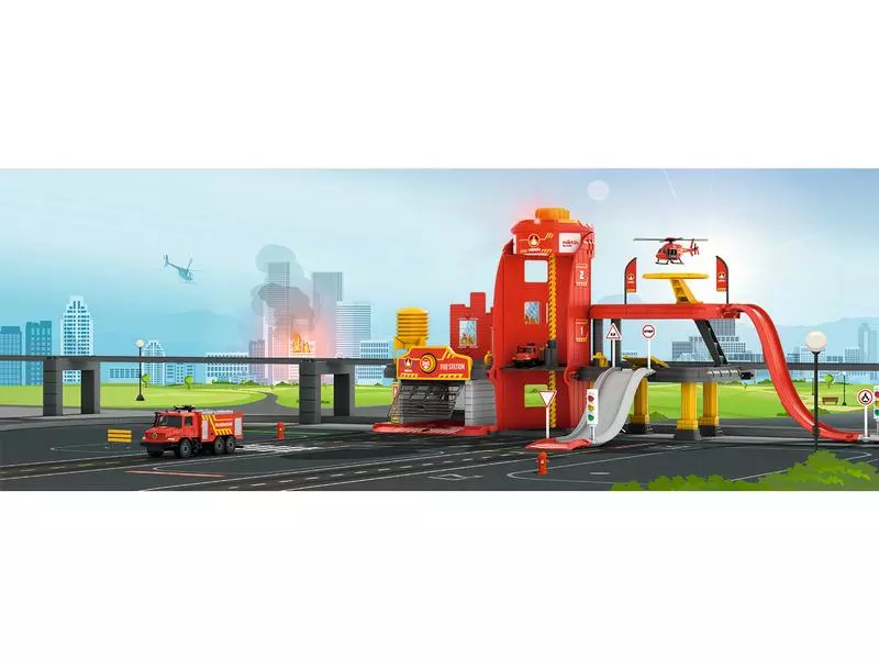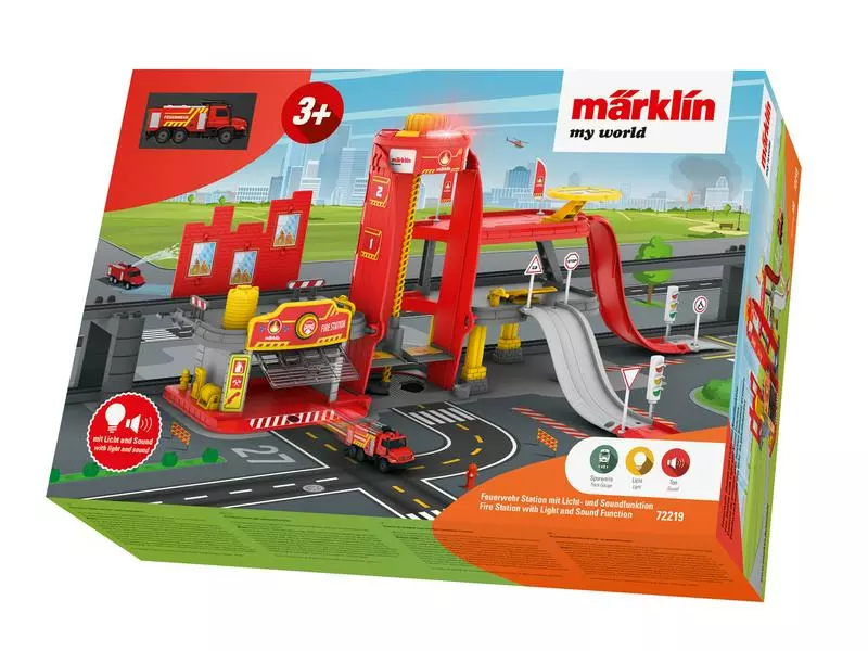 Die Feuerwehr Station bietet viele verschiedene Spielmöglichkeiten und verfügt über eine batteriebetriebene Licht- und Soundfunktion. Zahlreiche manuelle Spielfunktionen integriert: Aufzug, Autogarage zum Herausschiessen von Autos und viele weitere Spielfunktionen. Die beiden Gebäudehälften können über einen Drehpunkt in unterschiedlichen Winkelausführungen positioniert werden. Für die Gleisanbindung sind verschiedene Varianten möglich. Eine Möglichkeit besteht darin, das Gleis für die Märklin my world Hochbahn in Kombination mit der Feuerwehr Station zu nutzen. Durch die unterschiedlichen Varianten der Gleisanbindung auf der Ebene 0 und der Ebene 1, kann das Gebäude mit verschiedenen und mehreren Gleisbildern zugleich kombiniert werden. Die Strassenanbindungen sind mit dem Majorette Creatix Strassensystem kompatibel. Feuerwehr Station als stabiler Bausatz zusammensteckbar, daher geeignet für Kinder ab 3 Jahren. Klebebogen und Aufbauanleitung liegen bei. Batterien sind im Lieferumfang enthalten. Die Lieferung erfolgt in Einzelteilen.