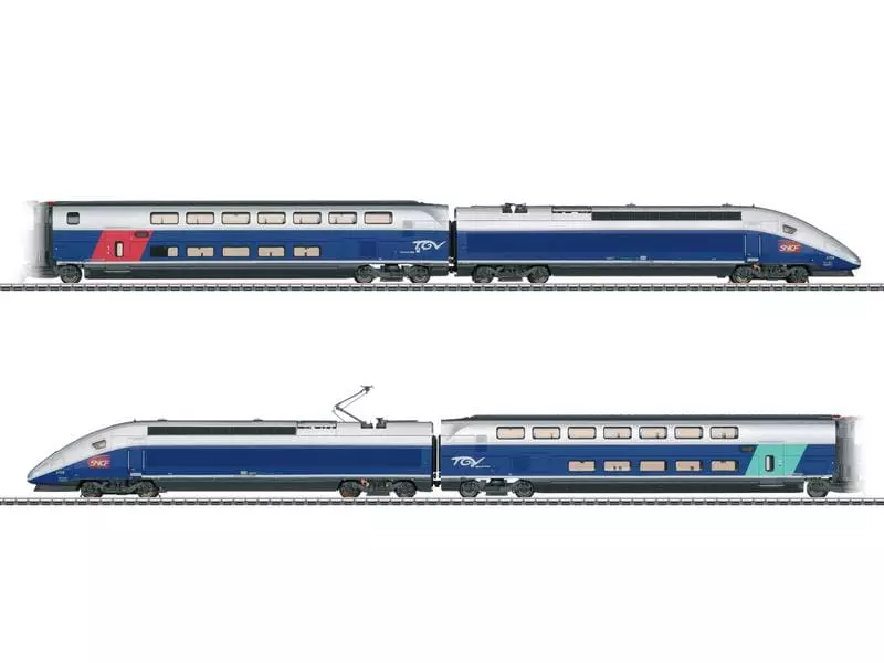 4-teilige Grundgarnitur. Beide Triebköpfe (TK1 und TK2) motorisiert. Mit Digital-Decoder mfx+ und umfangreichen Geräuschfunktionen. Geregelter Hochleistungsantrieb in beiden Triebköpfen, zentral eingebaut. Jeweils 4 Achsen über Kardan angetrieben. Haftreifen. Serienmässig eingebaute Innenbeleuchtung. Fahrtrichtungsabhängig wechselndes Dreilicht-Spitzensignal, 2 rote Schlusslichter und Innenbeleuchtung konventionell in Betrieb, digital schaltbar. Drittes Spitzenlicht für französischen Lichtwechsel digital separat abschaltbar (Lichtfunktion). Beleuchtung mit wartungsfreien warmweissen und roten Leuchtdioden (LED). Führerstände in den Triebköpfen mit Inneneinrichtung. Separat angesetzte Griffstangen aus Metall. Triebkopf und Übergangswagen sind paarweise fest miteinander gekuppelt, mit Spezial-Kurzkupplungen und Kulissenführung. Zusätzliche Kulissenführung im Jakobs-Drehgestell. Fahrtrichtungsabhängige Stromversorgung über den jeweils vorderen Triebkopf. Innenbeleuchtung wird versorgt über die durchgehende elektrische Verbindung des ganzen Zuges. Jeder Triebkopf mit 2 Einholm-Stromabnehmer in unterschiedlichen Ausführungen mit jeweils einer Wippe für DB und SNCF. Pantographen sind nur mechanisch, nicht elektrisch funktionsfähig. Massstäbliche Nachbildung, daher befahrbarer Gleisbogen ab Mindestradius 360 mm bei freiem Lichtraum.