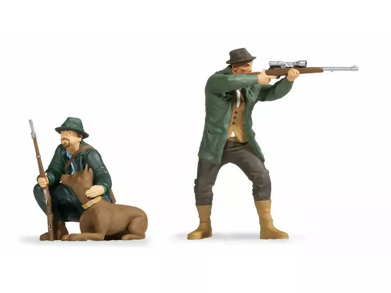 Das Figurenset enthält 2 Figuren. Ein Jäger steht mit seinem Gewehr da und zielt auf ein Reh. Er hat typische Jägerkleidung an, so trägt er einen Filzhut, hat eine grüne Jacke und dunkelbraune Hosen sowie Lederstiefel an. Der andere Jäger trägt ebenfalls traditionelle Jägerkleidung. Er sitzt auf dem Boden und streichelt seinen Jagdhund, der neben ihm Platz gemacht hat. Er hat sein Gewehr umgehängt.