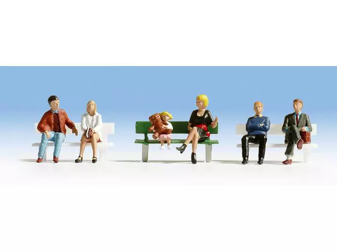 Menschen und Tiere dürfen auf keiner Modellbahnanlage fehlen, verleihen sie doch der aufwändig gestalteten Landschaft erst den letzten Schliff. Im Set sind sechs Erwachsene in sitzender Körperhaltung sowie eine Bank enthalten. Die Figuren im Massstab 1:87 sind handkoloriert.