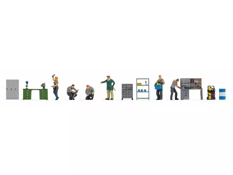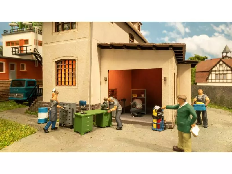 Modellbahnanlage Werkstätten, Lager, Garagen und Produktionsbetriebe. Unsere Werkstatteinrichtung enthält alles um genau diese Gebäude realistisch mit Leben zu füllen.