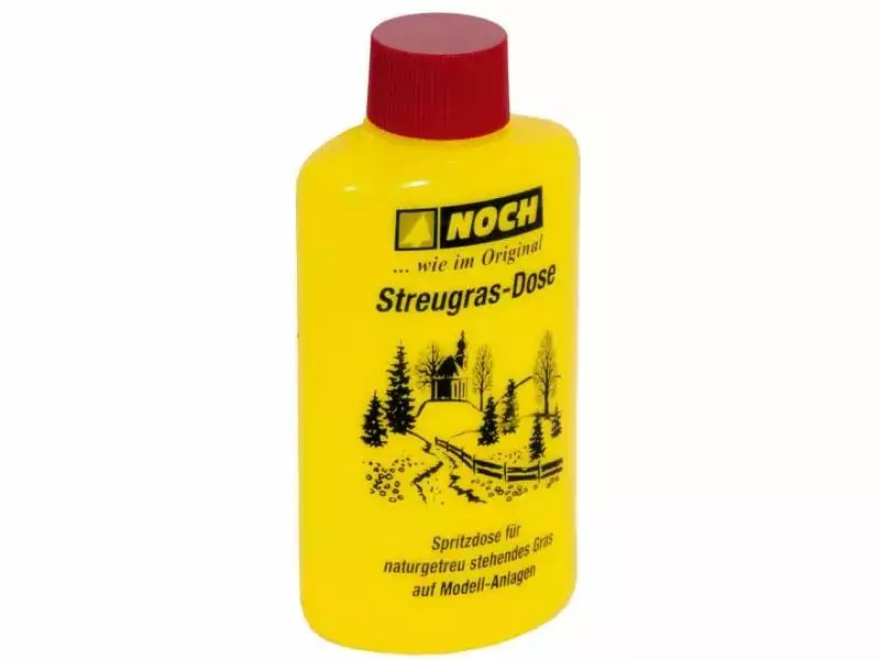 Die Gras-Spritzdose von Noch eignet sich zum einfachen und schnellen Begrasung Ihrer Modelleisenbahnlandschaft. Die Grasfasern werden in der Dose elektrostatisch aufgeladen, sodass sie auf einer eingeleimten Fläche aufrecht stehen. Am besten eignen sich Fasern mit einer Länge zwischen 1,5 und 2,5 mm, die aufgrund ihrer Beschaffenheit durch ein Schütteln der Dose elektrostatisch aufgeladen werden können. Um diesen Effekt effizient umsetzen zu können, sollten Sie die Dose lediglich bis zur Hälfte befüllen.