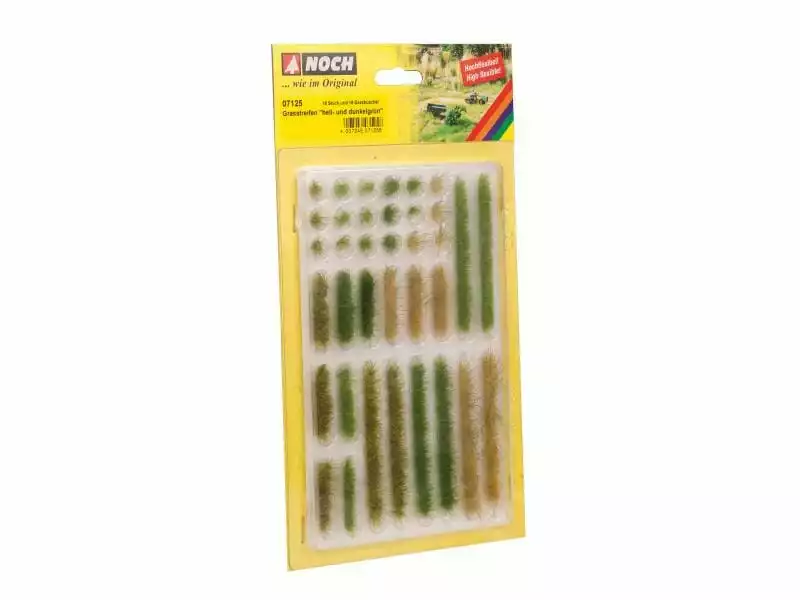 Mit den Grasstreifen von Noch können Sie Ihre Modelleisenbahnwelt individuell und bis ins kleinste Detail realistisch gestalten. So können Sie unter anderem Feldwege, Uferböschungen oder Wege an einem Waldrand schnell und einfach dekorieren und ausschmücken. Das Set umfasst 18 Grasbüschel sowie 18 Grasstreifen in zwei verschiedenen Grüntönen und Längen.