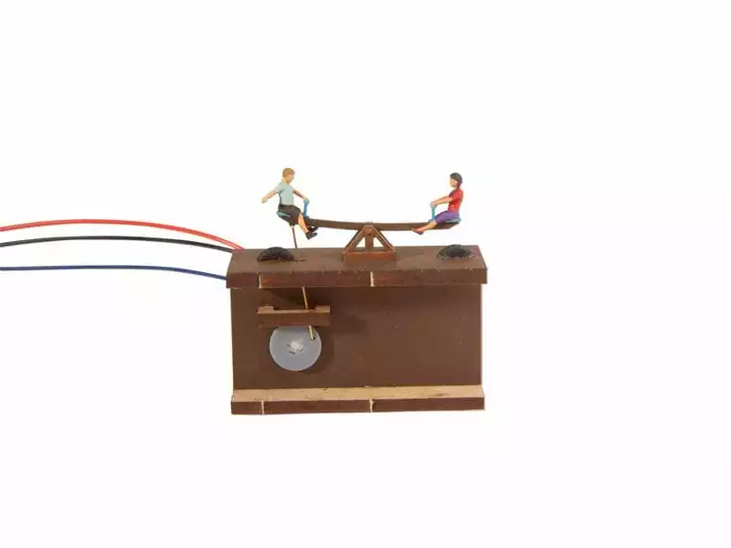 Fast jeder von uns dürfte schöne Kindheitserinnerungen an Spielplätze und an einzelne Spielgeräte haben. Die Schaukel, auf der wir von unseren Eltern stundenlang angeschuckt wurden; das Kinderkarussell, auf dem uns immer schwindelig wurde oder die Wippe, die so schwierig auszubalancieren war. Spielplätze sind in jeder Stadt und in jedem Dorf zu finden und somit ein wichtiger Bestandteil des menschlichen Zusammenlebens. Familien treffen sich, Kinder spielen und lachen, Eltern unterhalten sich über Arbeit und Erziehung und so mancher tauscht den neuesten Klatsch und Tratsch aus, während der Nachwuchs friedlich schaukelt. Nach dem letztjährigen grossen Erfolg des «Baums mit Schaukel» haben wir uns an die Entwicklung von vier bewegten Spielplatzgeräten gemacht: Eine Kinderwippe, eine klassische Schaukel, eine Vogelnestschaukel und ein Kinderkarussell. Die handbemalten Spielgeräte und Figurenmodelle sind komplett montiert. Jedes Gerät wird von einem Motor, der sich direkt unter dem Modell befindet (Einbautiefe 35 mm) angetrieben. Die Mechanik für den Antrieb wird als Bausatz geliefert. Die mitgelieferte Elektronik wird an einen üblichen 16-V-Modellbahntrafo angeschlossen und ist für Gleich- und Wechselstrom geeignet. Die Geschwindigkeit des Spielgeräts kann auf der Platine eingestellt werden.