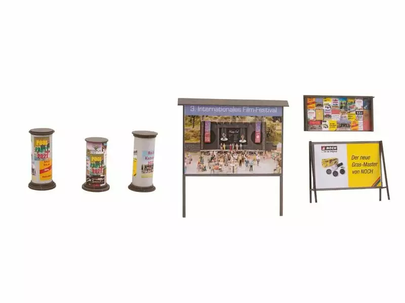 Die NOCH «Litfasssäulen & Werbewände» eignen sich hervorragend, um besonders Stadtszenen auf einer Modelllandschaft ideal auszugestalten. Wer kennt es nicht: man bummelt durch die Stadt und schon die erste Werbewand macht mit einem grossen Banner auf sich aufmerksam. Zu unterschiedlichen Themen wird Werbung gemacht: ob für Autos, Bekleidung, Urlaubsreisen, Zeitschriften, Flugreisen, Fernsehsendungen, Events oder auch die neusten Elektrogeräte, hier ist wirklich für jeden etwas dabei. So macht man direkt auf sich aufmerksam und zieht die Blicke der Passanten auf sich. Eine ideale Möglichkeit, um gezielte Werbung zu machen.