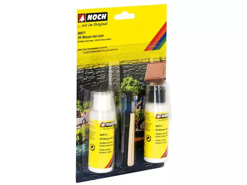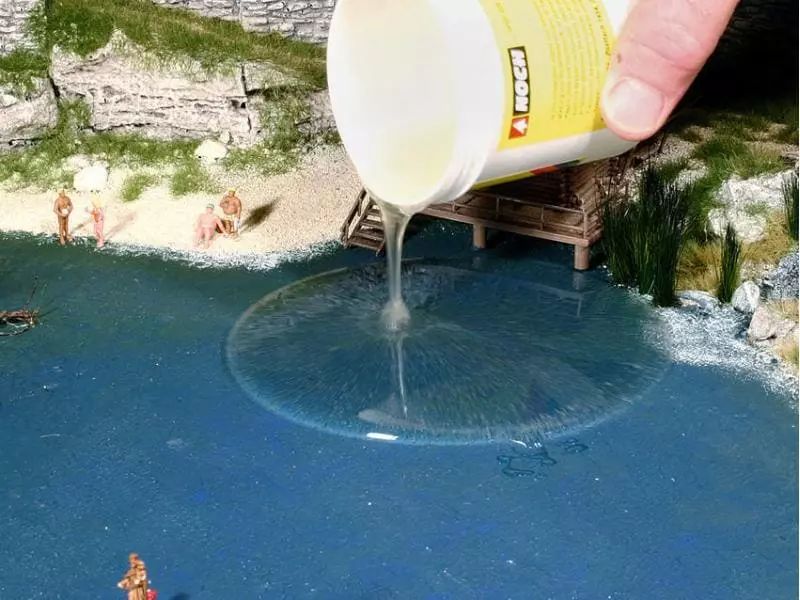 Mit dem 2K Wasser-Gel color von Noch können Sie Flüsse, Seen, Moore und Meere realistisch nachkonstruieren. Das Set enthält zwei Komponenten mit einer Menge von jeweils 50 ml. Diese werden in einem Verhältnis von 1:1 gemischt und miteinander verrührt. Ist die Mischung vollständig vermengt worden, können die entsprechenden Flächen im Modell einfach ausgegossen werden.