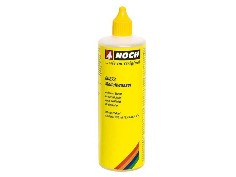 Mit der Modellwasser von Noch gestalten Sie natürlich wirkende Wasserflächen auf Ihrer Modellbahnanlage. So wird das Anlegen kleiner Seen, Teiche, Bachläufe, Rinnsale oder Wasserpfützen zum Kinderspiel. Giessen Sie das Modellwasser an der vorgesehenen Stelle ein und lassen Sie es etwa 12 Stunden lang trocknen. Dabei reduziert sich die Höhe des Wasserspiegels um ca. 50%. Für einen höheren Wasserstand ist ein wiederholtes Nachgiessen nach der Trocknung möglich.