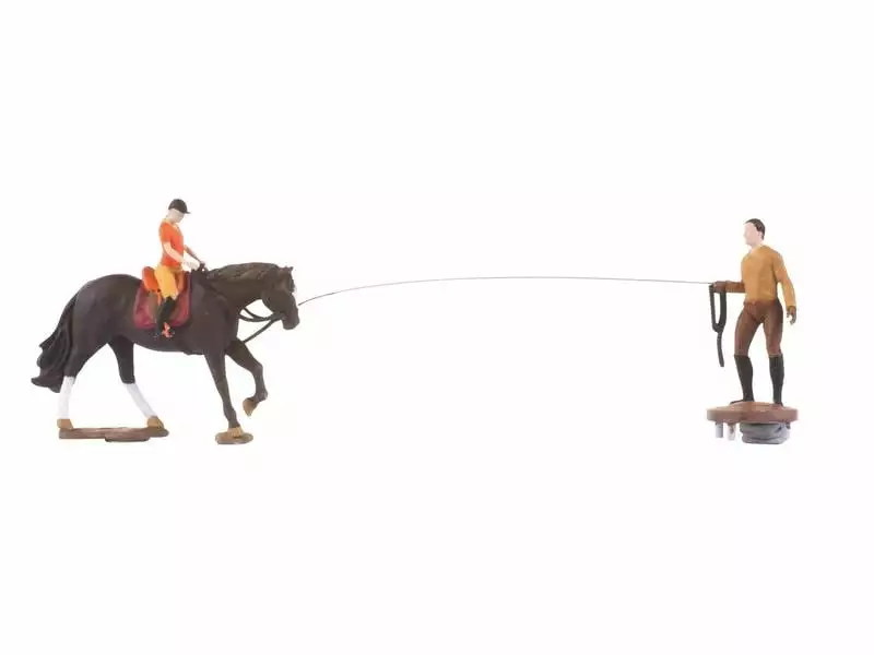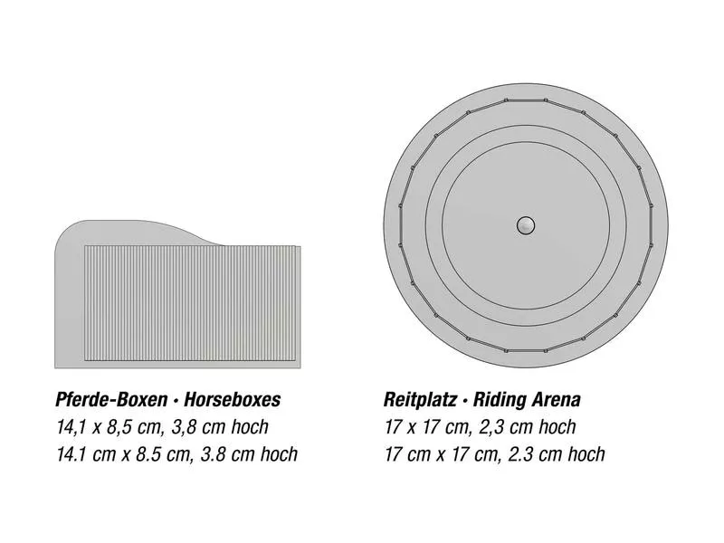 Mit diesem hübschen Longierplatz bringen wir Bewegung in Ihre Modell-Landschaft. Auf dem Reitplatz wird das Pferd vom Reitlehrer an der Longe im Kreis geführt, während die Reiterin sich ganz auf das Zusammenspiel mit dem Tier konzentrieren kann. Technisch wird das Pferd von einem Unterflurantrieb mit einem Magneten bewegt. Die Geschwindigkeit kann über einen Potentiometer auf der Platine eingestellt werden. Die mitgelieferte Elektronik wird an einem üblichen 16-V Modellbahntrafo angeschlossen und ist für Gleich- und Wechselstrom geeignet. Den absoluten Clou bietet das enthaltene Sound-Modul mit Lautsprecher: Während das Pferd longiert wird, ertönen Pferde-Wiehern und Hufschlag. Ein wunderschönes Thema, das Leben in ländliche Modell-Landschaften bringt und nicht nur zu unserem Bauernhof-Enseble perfekt passt! Dem Laser-Cut Bausatz liegen eine ausführliche Bauanleitung und ein passender Laser-Cut Spezialkleber bei.