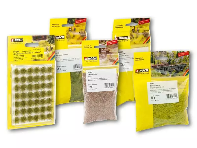 Mit dem Inhalt des Sets können Sie die Grund-Beflockung einer kleinen Wiese umsetzen. Dabei spielt es keine Rolle, ob es eine Wildwiese, eine Koppel oder eine Weide für Tiere werden soll. Mit dem braunen Streumaterial können Sie auch kahle Stellen in der Grasfläche nachempfinden. Neben Streugras und Strukturflock befinden sich auch Grasbüschel in dem Startset «Wiese», welches Felder und Wiesen noch realtistischer wirken lassen.